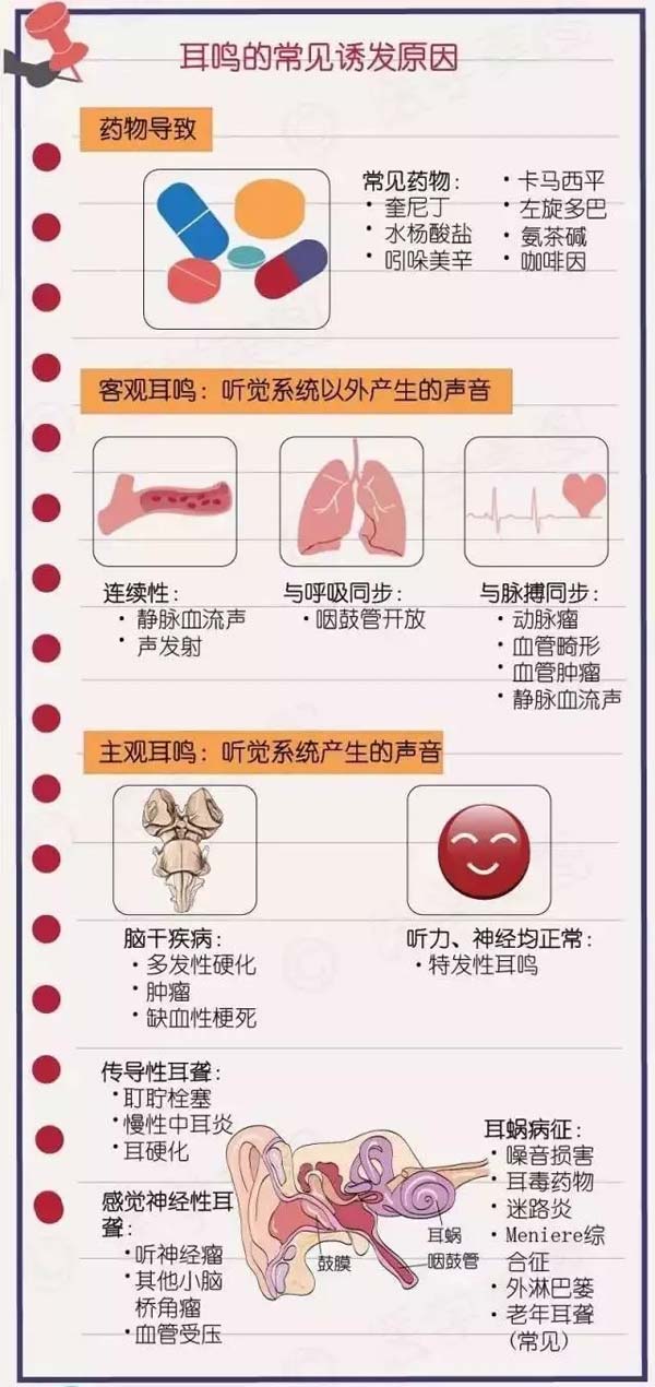 5、鼻咽部疾病长期不愈导致,采取相应治疗措施痊愈后,耳鸣也会随之消失。但约有40%病人的耳鸣找不到明显的病因,称为不明原因性耳鸣。