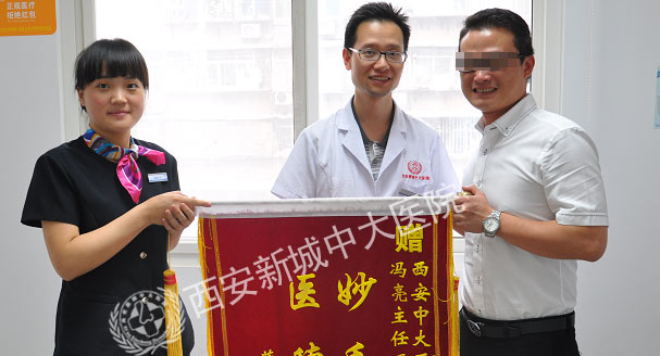 叶勇先生感激地给冯亮医师送来锦旗并合影
