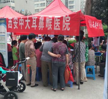 5月31日一大早,西安海容阳光城社区广场上就人头攒动,西安晚报邀请到西安新城中大耳鼻喉医院走进社区开展公益义诊活动,社区居民排着队,他们一边互相诉说着自己的身体状况,一边等候着中大医院医生为他们排忧解难。