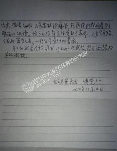 2014年11月15日,西安中大耳鼻喉医院再现传统书信,患者以笔墨传情的方式表达对医院的感谢之情。面对当今电子信息化世界,一封由前段时间在医院接受公益治疗的傅大爷亲笔所写的感谢信,字里行间充满了浓浓情意,感动了西安中大耳鼻喉医院的每一位医务人员。