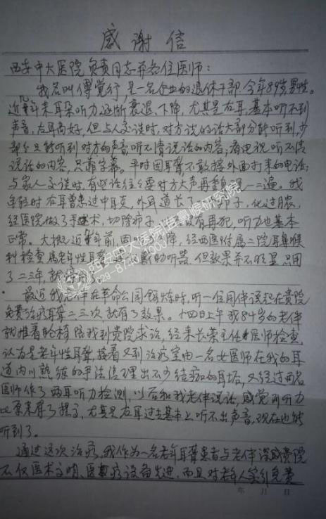 傅大爷在信中最后表示:通过这次治疗,作为一名老年耳聋患者与老伴深感,医院不仅医术高超、医疗设备先进,而且对老年人实行公益治疗...十分感谢西安中大耳鼻喉医院对我的援助,让我有重新听见的机会。