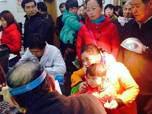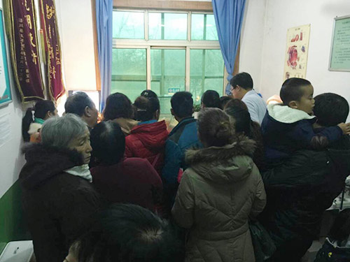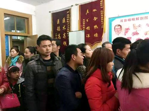 延安洛川县凤栖镇卫生院会诊现场,人群汹涌如潮,会诊室,甚至走廊外早已水泄不通。张全安教授等中大专家在众多患者的围拥之下,依然表现得耐心细致,冷静严谨,丝毫没被周围环境所影响,而是以眼前患者为重。