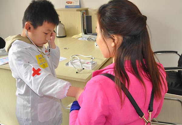 除了为家长听诊外,小朋友们还在医生的协助下完成了为爸爸妈妈检查视力、测血压等身体健康检查项目。让家长孩子们在游戏中增强互动,学会感恩与关怀。