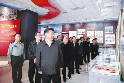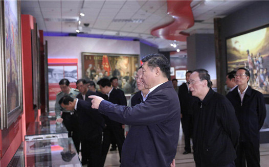 下午3时10分,习近平等领导同志来到中国革命军事博物馆,走进展厅参观展览。展览以时间为顺序,以重要战役战斗、重大历史事件和重要人物为主体,精心遴选了“七根火柴”“金色鱼钩”“半截皮带”等经典长征故事,精心设计了“遵义会议”“飞夺泸定桥”“过雪山草地”等大型主题景观,通过275张照片、252件文物和大量视频、图表、油画、雕塑等,展现了中国共产党领导红军高举抗日救亡旗帜,粉碎上百万国民党军队围追堵截,战胜无数艰难险阻,胜利完成举世闻名的万里长征的光辉历史和英雄壮举,彰显了红军在长征中表现出来的坚定的共产主义理想、革命必胜的信念、艰苦奋斗的精神和一往无前、不怕牺牲的英雄气概,揭示了“不忘初心,走好新的长征路”的时代内涵。